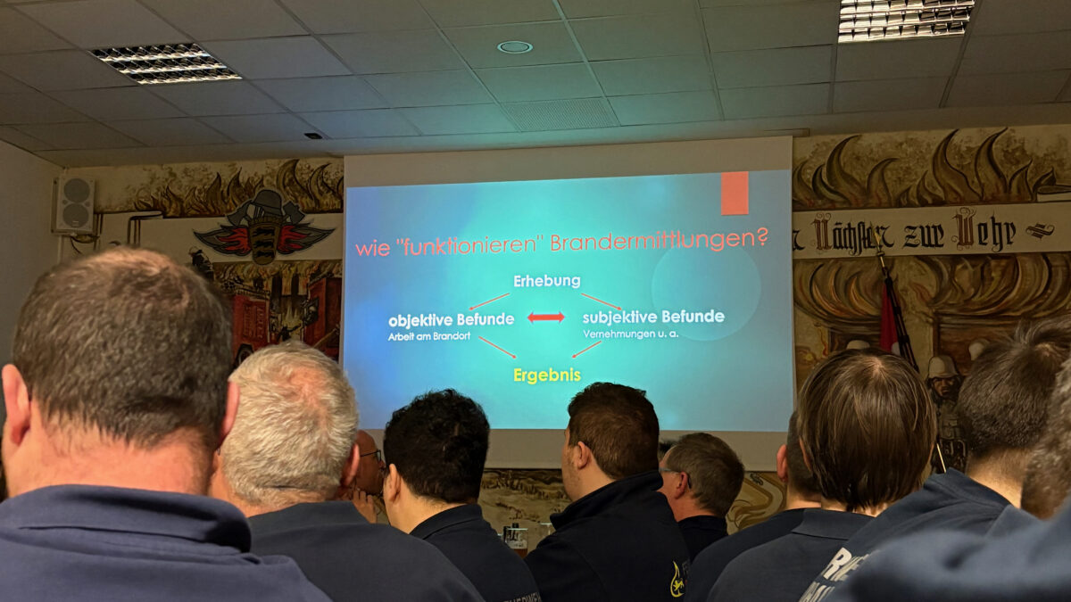 Im Rahmen des Dienstabends hielt ein Kollege der Kriminalpolizei Heidelberg aus dem Bereich Brandermittlung einen interessanten und praxisnahen Vortrag. Er gab Einblicke in seine Aufgaben und Arbeitsweise und zeigte auf, wie die Zusammenarbeit zwischen Feuerwehr und Kriminalpolizei im Einsatzfall abläuft.